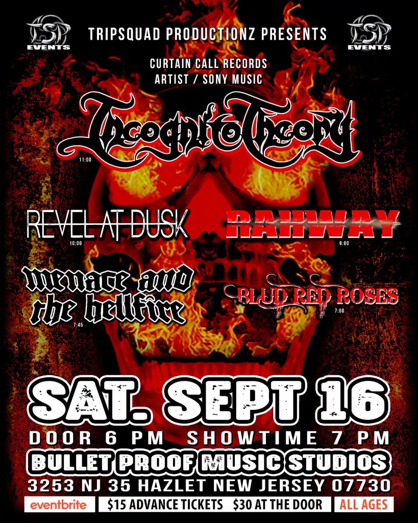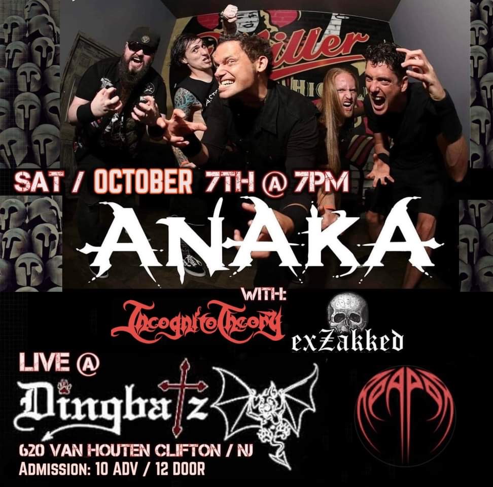 Incognito Theory has two big upcoming shows. Saturday, September 16th they’ll be at BulletProof Music Studios in Hazlet, New Jersey with Revel At Dusk, Rahway, Menace And The Hellfire, and Blud Red Roses. Saturday, October 7th Anaka is the headliner at Dingbatz in Clifton, New Jersey, and will be joined by Incognito Theory, Reaper, and exZAKKed.