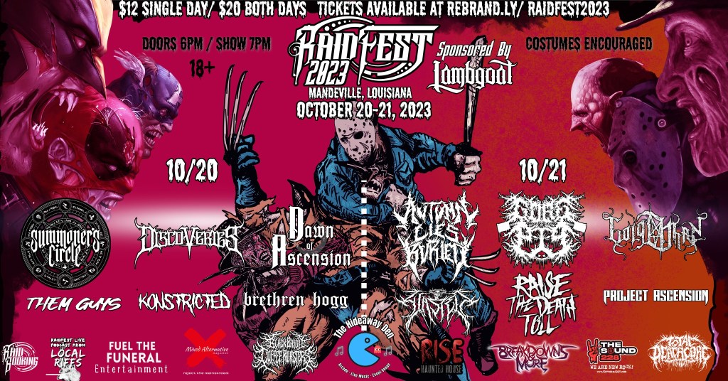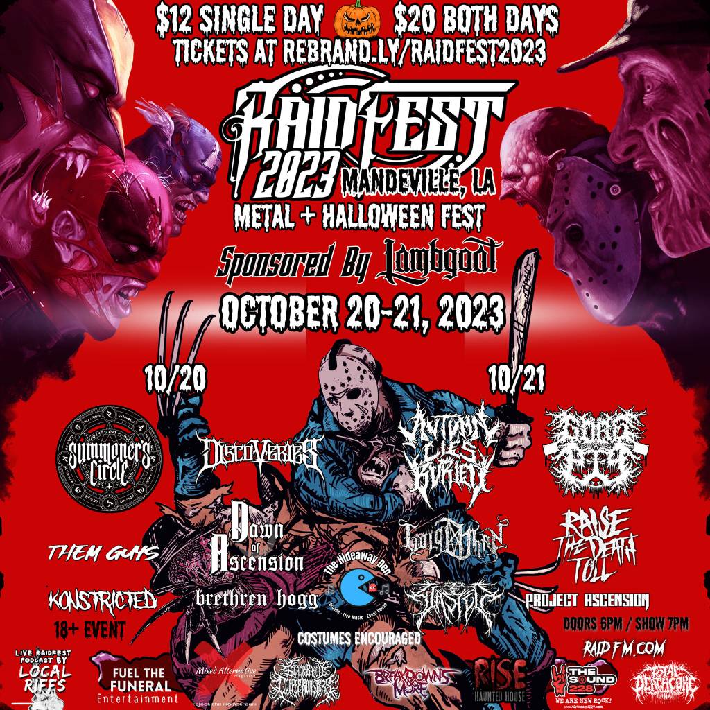 Raid Invade is planning the second annual Raidfest 2023 Friday, October 20th and Saturday, October 21st at The Hideaway Den at 800 N. Causeway Boulevard in Mandeville, Louisiana. Costumes are encouraged at this metal and Halloween festival. Doors will open at 6:00pm and the show starts at 7:00pm both nights. It is a 18-and-over event, and tickets, which are $12 for one day and $20 for both days, can be purchased in advance. Click HERE for information about ordering tickets.