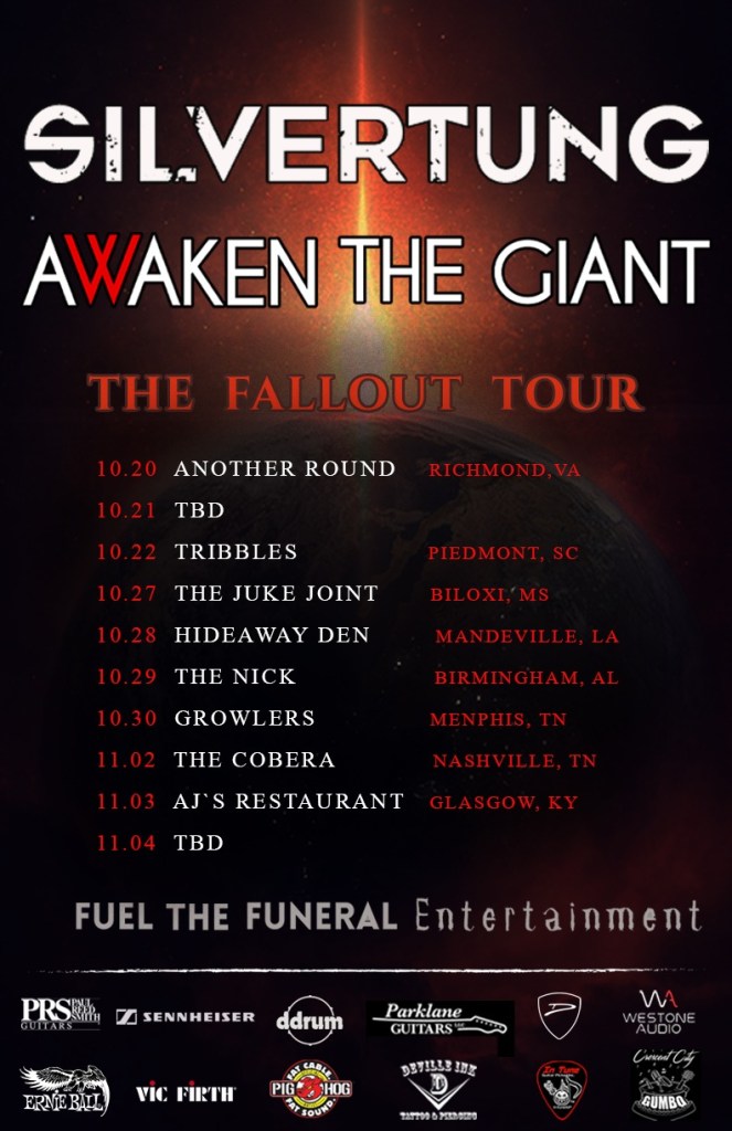 Silvertung has been on the road a lot this year, performing in the Midwest as well as Pennsylvania, New Jersey, and Delaware. The band, in conjunction with Fuel The Funeral Entertainment, just announced The Fallout Tour with their friends Awaken The Giant, from Houston, Texas and Biloxi, Mississippi. These two energetic bands did a tour of the Midwest together back in March, and they got along so well they decided to go out again. This tour will start in Richmond, Virginia October 20th and will take them to South Carolina, all the way to Biloxi, Louisiana, and Alabama, then back to Tennessee and Kentucky. There are still some dates and locations to be determined on the tour, which, if the previous one is any indication, should be a blast for all who are able to attend.