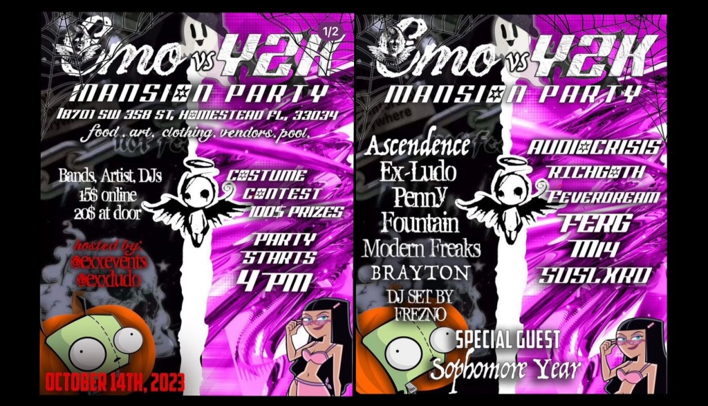 “The Emo vs. Y2K Mansion Party is at a stunning mansion venue in Homestead, Florida. Enjoy music from DJs playing late ’90s and 2000s hits along with EMO anthems from 4:00pm to 7:00pm. An alternative market of 10 vendors, including a Mexican food truck and 420 vendor, will also be hosted on the property. Participate in the outfit contest for a chance to win $100 in both categories Y2K and Emo, respectively. Experience the talents of nine local artists and headliners, Audio Crisis, EX-LUDO, and Ascendance. There will also be a pool with other festivities available so make sure to bring a change of clothes.”